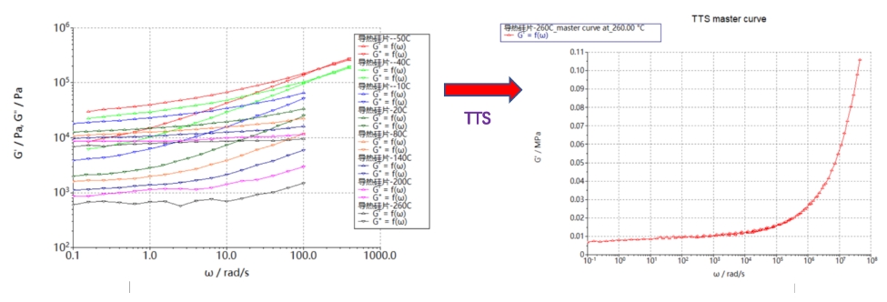 當(dāng)然我們除了可以進(jìn)行固定溫度點(diǎn)下的頻率掃描測試外,還可以進(jìn)行多個(gè)溫度點(diǎn)下的頻率掃描測試,然后根據(jù)時(shí)溫等效原理(TTS):低溫模擬高頻數(shù)據(jù),高溫模擬低頻數(shù)據(jù),最終經(jīng)過HAAKE RheoWin軟件處理計(jì)算獲得更寬范圍頻率的實(shí)驗(yàn)測試數(shù)據(jù)(如下圖)。